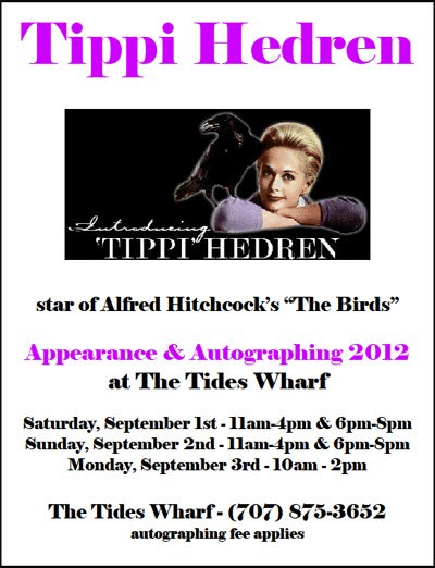 Tippi Hedren will be making an appearance and signing autographs at The Tides Wharf from September 1-3, 2012. Tippi recently discussed her relationship with director Alfred Hitchcock which has been made into a HBO movie.