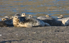 Harbor Seals are protected by the Marine Mammal Protection Act. They haul out, reoxygenate their blood, rest and sleep during much of the day. This and a thick blubber layer enables them to take deep dives, 300’ plus, and stay under on average 23 minutes, as they forage mostly at night in the cold ocean waters off our coast.