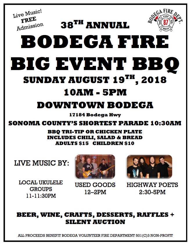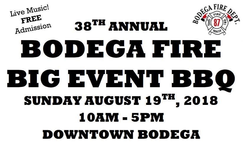 The Bodega Volunteer Fire Department is an immeasurable asset to our community and I suggest we jump at every opportunity to support them so they can keep returning the favor and helping us stay safe. As the name implies, this event is the biggest fundraiser of the year. So bring friends and family, and make sure to pack healthy appetites and thirst along with a desire to have fun.