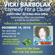 Join us for “Comedy for a Cause with Vicki Barbolak & Friends, featuring Santa Rosa’s own Oliver Graves aka Hex of Spades from America’s Got Talent®, Sue Alfieri and Lou Brockman on the Piano” on Friday, December 14, 2018, at The Yacht Club at Bodega Harbour located at 565 Smith Brothers Road in beautiful Bodega Bay.